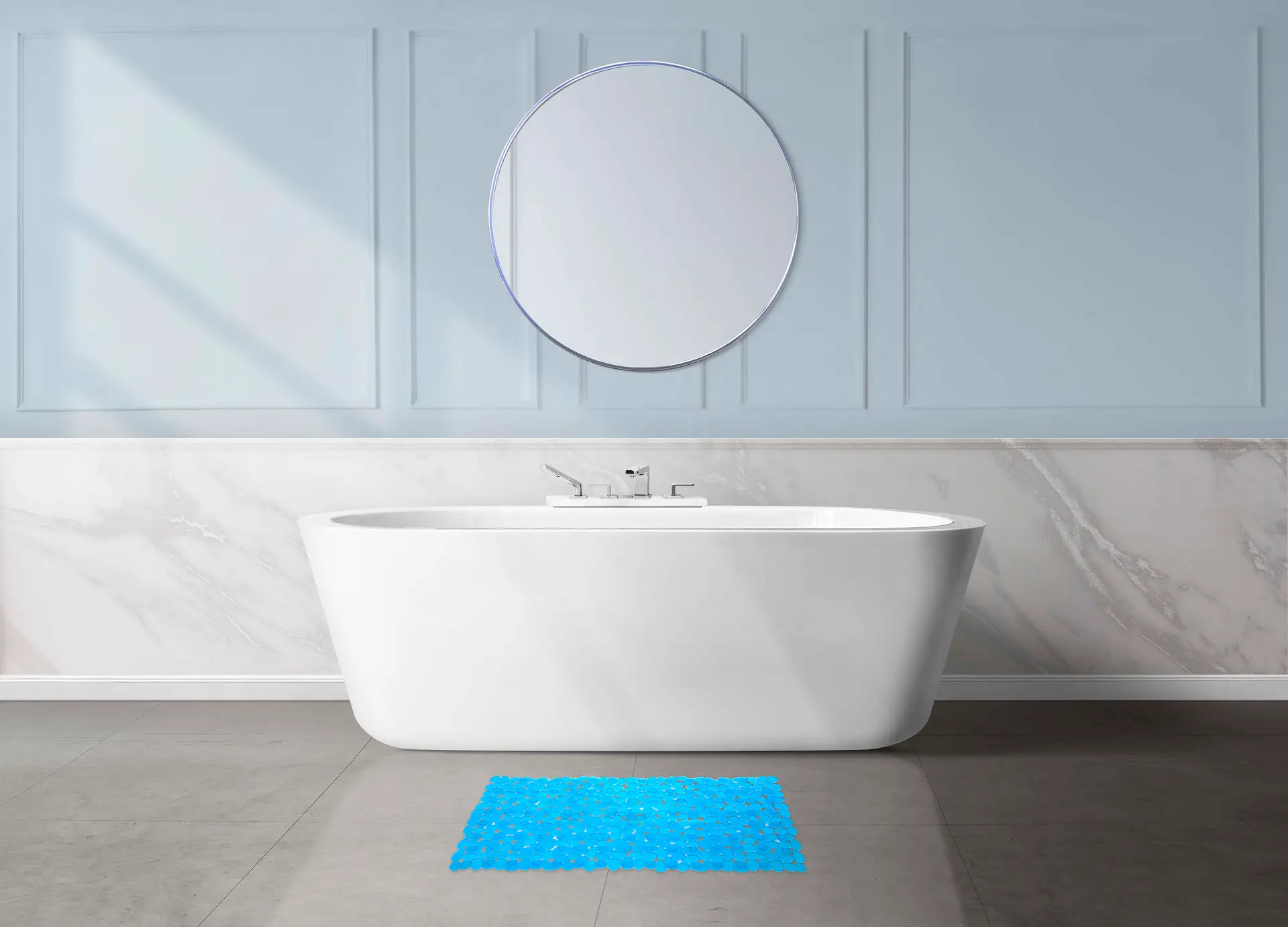 לבחירה מדויקת של אביזרי אמבט איכותיים יש אפקט מדהים. כזה שהופך כל חדר רחצה לממלכה! בדיוק כמו שטיחון אמבט מבית AQUILA. שטיחון אמבט איכותי ומעוצב בגודל 70X35 ס״מ, עשוי מ-100% PVC ומעניק ביטחון מקסימלי כנגד כל סכנת החלקה. כל זאת הודות לוואקום חזק במיוחד הנצמד היטב לרצפת האמבטיה או המקלחת. מגיע בעיצוב ייחודי של חלוקי נחל קטנים, שקופים וכחולים שפשוט משדרג את האמבטיה.